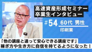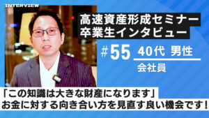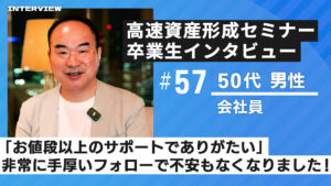 卒業生インタビュー 【高速資産形成セミナー卒業生 インタビュー57 50代男性 会社員】「お金の不安がなくなり、退職後も安心して過ごせる道が見えました」 この記事では高速資産形成術の無料セミナーおよび本講 Read More »