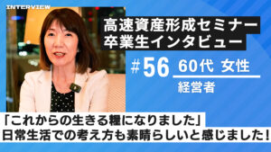 卒業生インタビュー 【高速資産形成セミナー卒業生 インタビュー56 60代女性 経営者】「年金生活に不安があるなら、飛び込む価値はあります」 この記事では高速資産形成術の無料セミナーおよび本講 Read More »